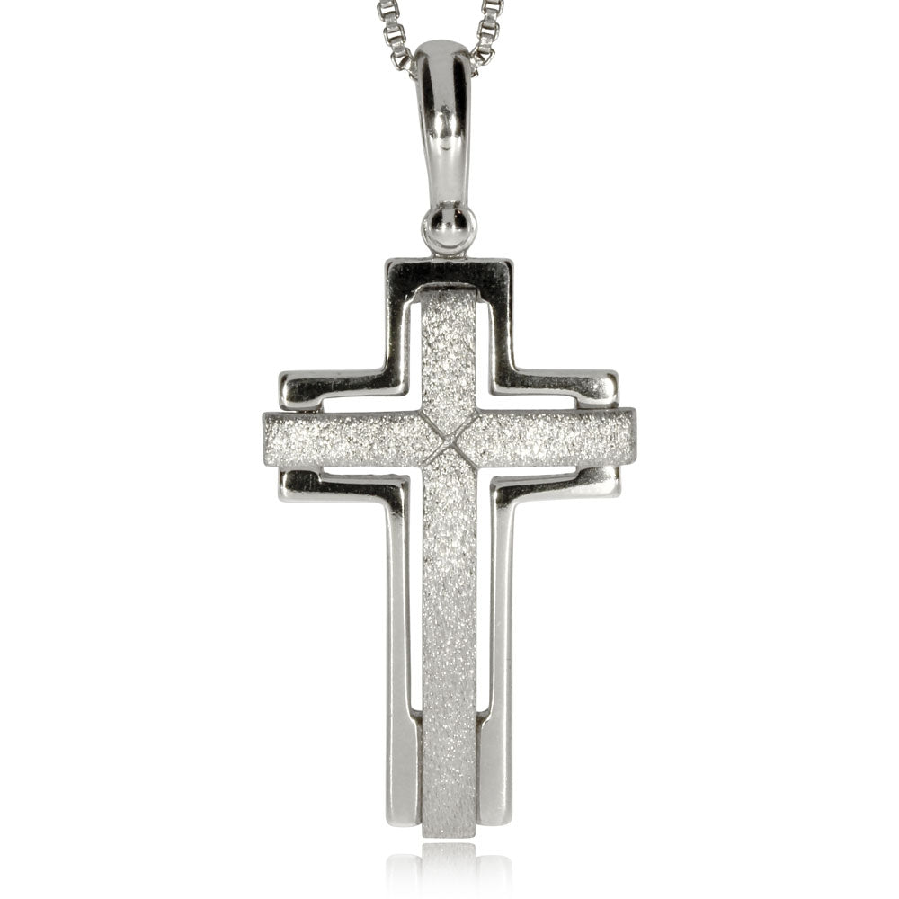 Stříbrný křížek na krk působí robusnějším dojmem díky zdvojenému designu. Kombinace lesklého a matovaného stříbra podtrhuje moderní pojetí prastarého symbolu. Křížek se hodí pro muže i ženy a může být zavěšen i na silnějším řetízku, protože má dost velké očko na jeho provlečení.