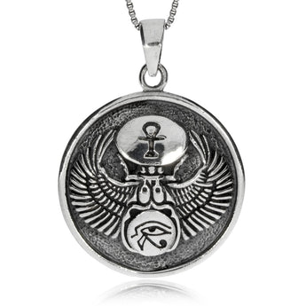 Větší kulatý přívěsek je vyroben ze stříbra o ryzosti 925/1000 s patinovaným povrchem. Zajímavě kombinovaným symbolům egyptské tématiky dominuje okřídlený skarabeus - vruboun posvátný. Malé sošky tohoto brouka se vkládaly do hrobů, aby mrtvému pomohly přejít \"na druhý břeh\". Symbolem života je malý nilský křížek ankh a Horovo oko je mnohovýznamné, zejména značí vševidoucnost. Přívěsek má průměr téměř 3 cm a je poměrně těžký. Vyžaduje proto silnější řetízek nebo kaučukový návlek.