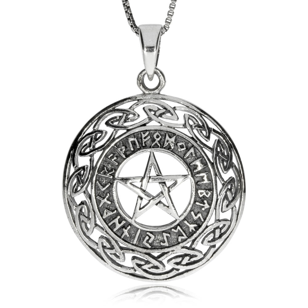 Kulatý přívěsek z patinovaného stříbra sese ve svém středu pentagram. Širší kulatý lem pentagramu je zdoben nekonečnými keltskými smyčkami a nápisem z run. Amulet je zavěšen na jednoduchém lesklém očku, kterým lze provléknout i silnější řetízek.