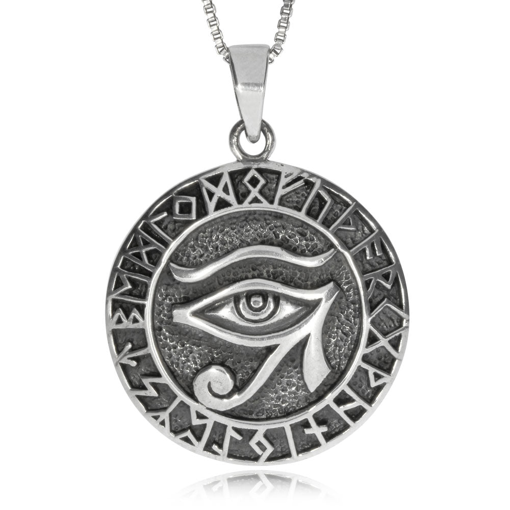 Kulatý stříbrný přívěsek má tmavě patinovaný posklad, ze kterého vystupují světlé kontury staroegyptského motivu Horova oka. Runy po obvodu tvoří zajímavou kombinaci různých kulturních prvků.