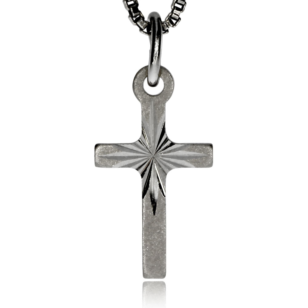 Drobný stříbrný přívěsek - křížek s lesklými výbrusy na středu.