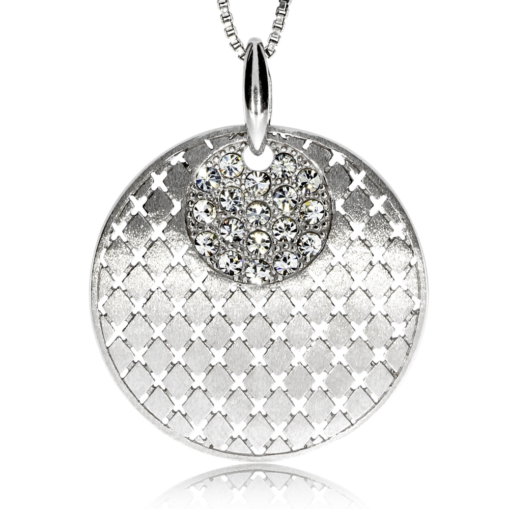 Elegantní stříbrný přívěsek pro sváteční příležitosti okouzlí kombinací protikladů - matný povrch stříbra je kontrastu se třpytem drobných křištálových šatonů. Přívěsek je dost velký a bude proto nepřehlédnutelnou ozdobou tmavé večerní toalety.