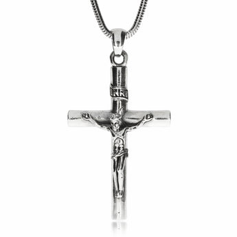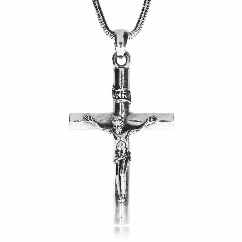 Větší stříbrný přívěsek ve tvaru kříže s Ježíšem Kristem a nápisem INRI je detailně provedený. Starostříbrná patina na šperku dává vyniknout reliéfu postavy i kříže a díky ní má přívěsek starobylý ráz.