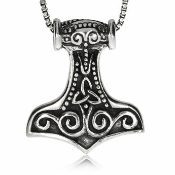 Stříbrný přívěsek se začernalým povrchem ve tvaru Thorova kladiva. Přívěsek je ozdoben smyčkami a drobnými kuličkami, které díky patině pěkně vynikají. Přívěsek je vhodný jak pro ženy, tak pro muže. Svojí velikostí patří spíše k menším přívěskům tohoto typu (výška 2,35 cm).
