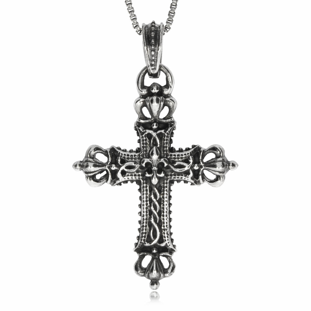Stříbrný přívěsek, který se hodí pro muže i ženy přestavuje velmi zdobný a detailně propracovaný křesťanský kříž. Povrch stříbrného šperku je patinován starostříbrnou úpravou a působí starožitně. Zajímavé detalivy přestavuje znak lilie na středu a stylizované královské koruny na koncích ramen kříže.