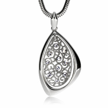 Dámský stříbrný přívěsek nepravidelného trojúhelníkového tvaru okouzlí vyvážeností své nepravidelnosti. To nepochybně ocení ženy, které nemají zálibu v symetrických špercích. Vnitřní prostor šperku je zdoben ornamentem, který je doplněn třpytivým efektem Swarovského křišťálu v malých čirých šatonech. Tento stříbrný přívěsek je společně s očkem pro řetízek delší než 4 cm a bude proto nepřehlédnutelným doplňkem společenských šatů.