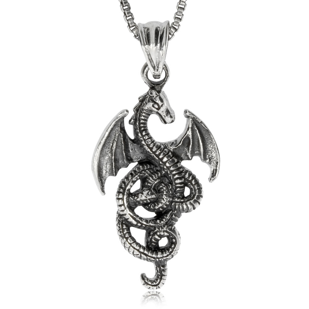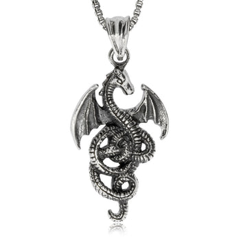 Stříbrný přívěsek ve starostříbra zobrazuje bájnou bytost draka s tělem hada a s blanitými křídly. Takoví draci jsou v čínské mytologii uctíváni a považováni za přátelské a ochranitelské bytosti. Čínský drak je vždy pouze jednohlavý, má schopnost létat a je spojován se symbolem jang. Přívěsek s drakem je spíše menší velikosti (3 cm včetně úchytu), je ale velmi detailně propracovaný. Pokud vás zajímá východní kultura a mytologie, může vám drak jako jeden ze symbolů čínského zvěrokruhu přinést radost.