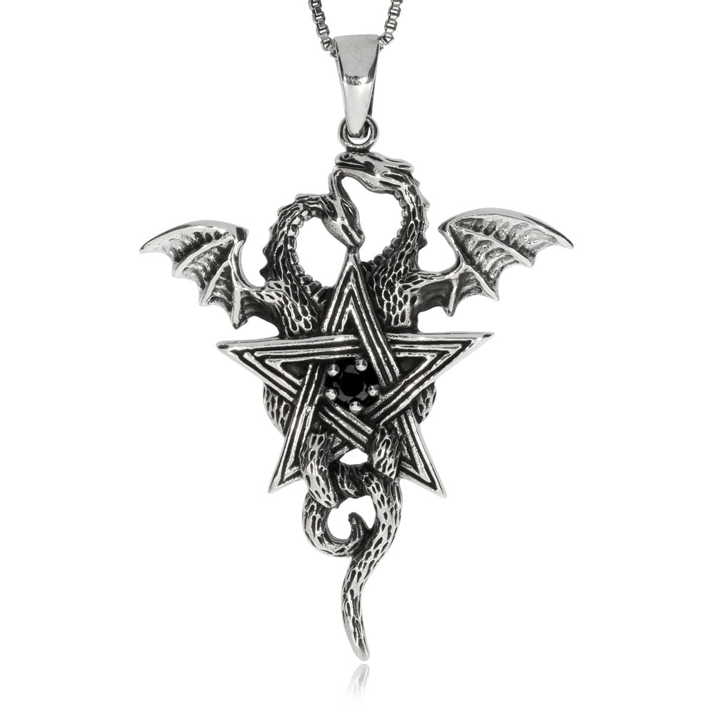 Stříbrný přívěsek se starostříbrnou povrchovou úpravou je označován jako moderní dračí symbol - dva draci vzájemně propletení s petagramem. Přívěsek má vyváženou kompozici a tak nehledě na jeho mystický význam je esteticky velmi přitažlivý zejména pro milovníky šperků s nádechem starobylosti. Celková výška přívěsku je více než 5 cm a jeho hmotnost dosahuje 8 gramů stříbra. Patří tedy k větším přívěskům a je třeba s tím počítat při výběru vhodného návleku.