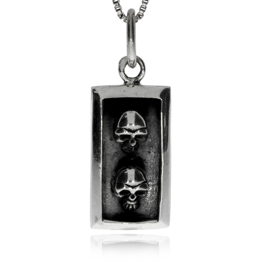 Originálně zpracovaný přívěsek obdélníkového tvaru, ve kterém jsou zobrazené dvě hrůzostrašné lebky. Netradiční šperk je vyrobený ze stříbra se starostříbrnou úpravou povrchu.
