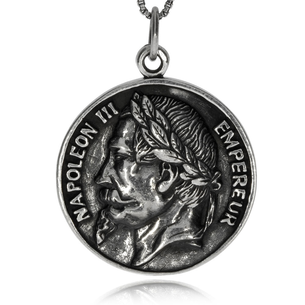 Originální kruhový přívěsek, který je vyrobený ze stříbra se starostříbrnou povrchovou úpravou. Ta působí, jako by šperk pocházel z dávných dob. Na oboustranném přívěsku je vyobrazený Napoleon III., mocný evropský panovník.