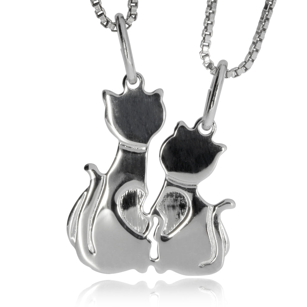 Velice zajímavý a pěkný přívěsek, který se skvěle hodí pro dvě kamarádky, zamilované, nebo kohokoli, koho máme rádi. Přívěsek se dvěma kočkami se dá rozlomit, vzniknou tak dva samostatně nositelné přívěsky. Šperk je vyrobený ze stříbra s vrstvou odolného a lesklého rhodia.