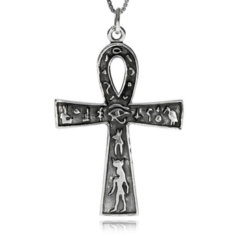 Pěkně zpracovaný stříbrný přívěsek v sobě spojuje motiv Ankhu, nilského kříže, a jemné zdobení egyptskými hieroglyfy. Prastarou symboliku doplňuje starostříbrná povrchová úprava, která dodává přívěsku historický půvab.