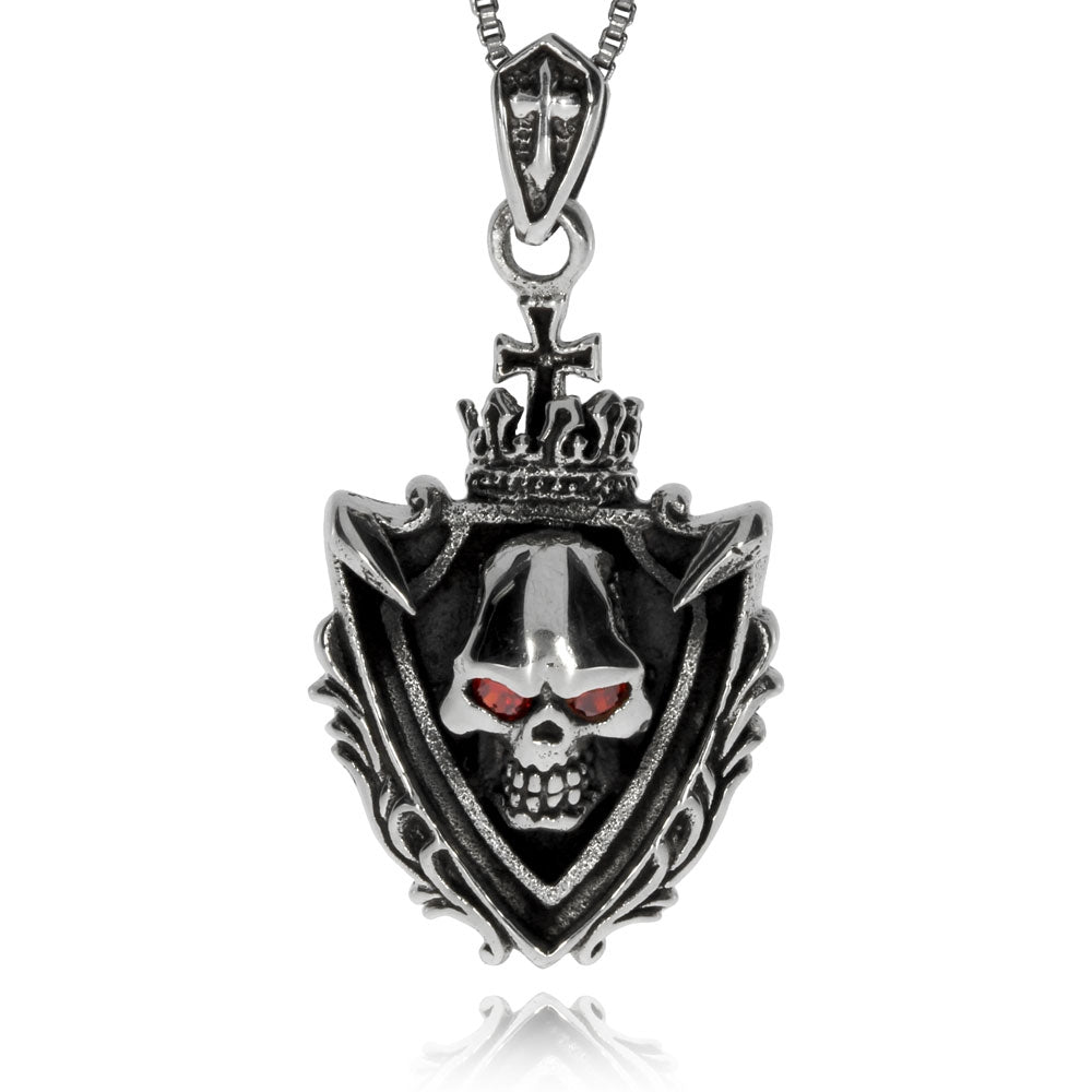 Originální a velice netradiční přívěsek působí, jako by pocházel z temného středověku. Přívěsek je vyrobený ze stříbra se starostříbrnou úpravou, která mu dodává historický ráz. V jednoduše zdobeném erbu je zasazené lebka s červenýma očima.