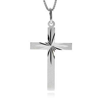Stříbrný rhodiovaný křížek má matný povrch s ozdobným lesklým brusem. Křížek je téměř pět centimetů vysoký a může být zavěšen na silnější řetízek.