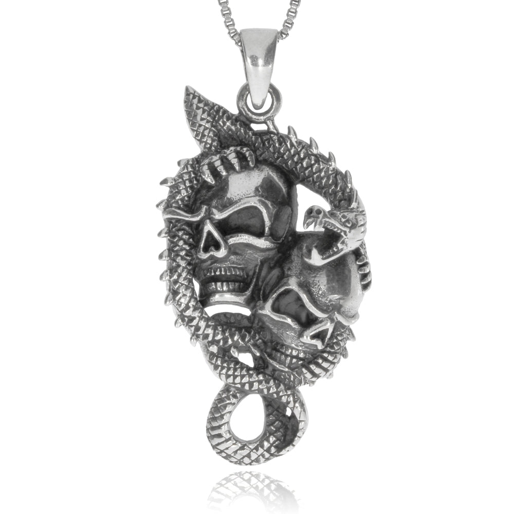 Originálně zpracovaný přívěsek s tajuplným motivem, kterou upoutá svým netradičním zpracováním. Přívěsek působí jako ornament, ve kterém jsou rozeznatelné dvě lebky, kolem kterých se vine drak, bájné zvíře, které se objevuje v mnoha různých kulturách. Šperk je vyrobený ve starostříbrné úpravě.