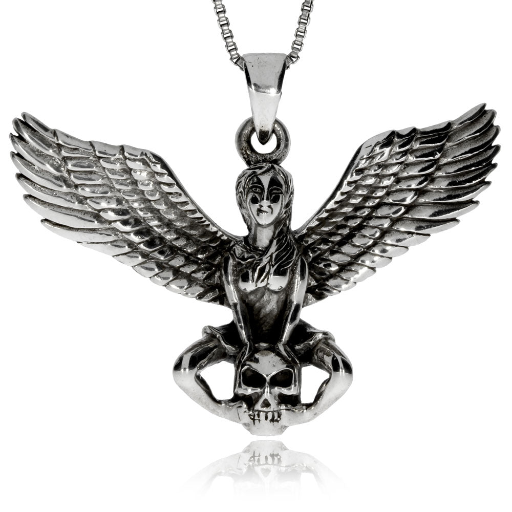 Velice zajímavě zpracovaný přívěsek, který v sobě spojuje různé symboly a starostříbrnou povrchovou úpravu, která šperkům dodává dojem starobylosti. Přívěsek vyobrazuje okřídlenou ženu, která sedí na lidské lebce.