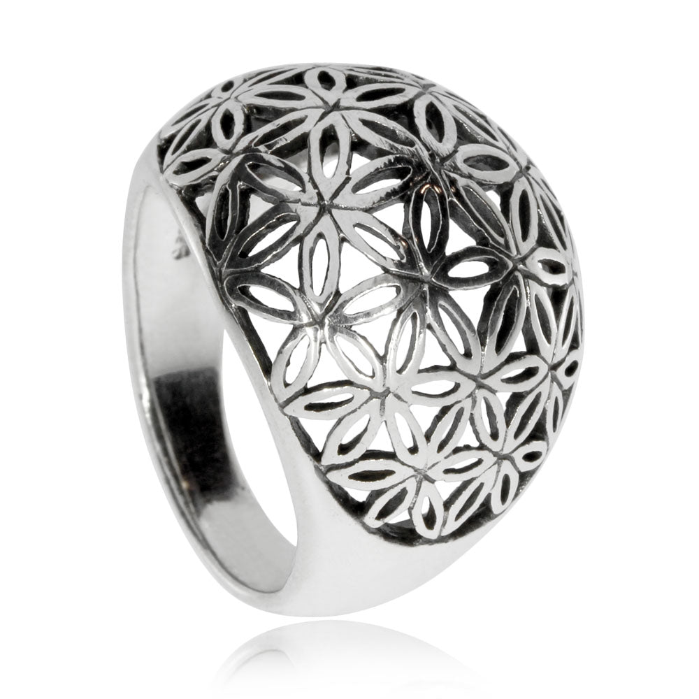 Dámský stříbrný prsten s vypouklou přední stranou je ozdoben starodávným symbolem květu života. Vzájemné prolínání kružnic přes středy kruhu vytváří květinový motiv, který patří k velmi starým obrazcům tak zvané posvátné geometrie. Šperk je vyroben ze stříbra o ryzosti 925/1000, které je na povrchu pokryto starostříbrnou patinou.