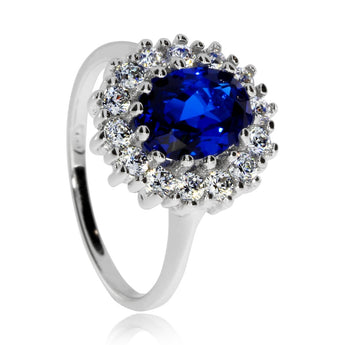 Stříbrný prsten s modrým oválným kamenem a čirými zirkoniemi
