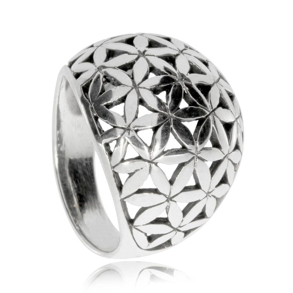 Dámský stříbrný prsten s nápadným motivem květu života. Tento starodávný symbol z prolínajících se kružnic je velmi atraktivní rovněž na tomto šperku. Prsten je vyroben ze stříbra o ryzosti 925/1000, které je na povrchu patinované. S ohledem na vyšší hmotnost (6,3 gramu) je prsten označen státním puncem. Tento elegantní design se velmi dobře hodí pro každodenní společenskou příležitost a není příliš náročný na údržbu. Vyčištění jemným kartáčkem pod proudem vody a vyleštění jemným flanelem prstenu občas velmi prospěje. Pro důkladnější renovaci šperku je vhodné se obrátit na odbornou klenotnickou opravnu.