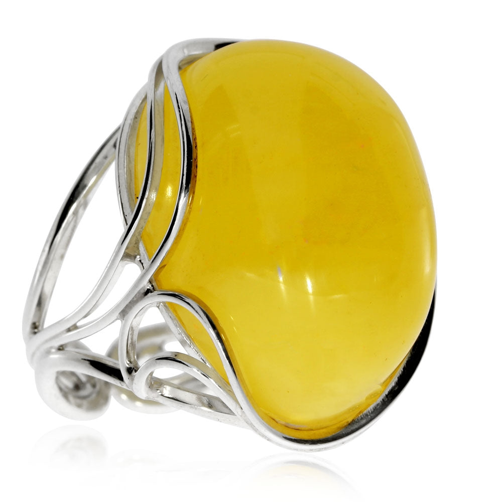Nápadný dámský prsten s pravým jantarem oválného tvaru ve stříbře. Jantarový ovál vyletěný do vysokého lesku je zasazen do stříbrný zvlněných linií, které elegantně přecházejí do kroužku prstene. Tento jantarový šperk je vhodný pro slanostnější společenskou příležitost již s ohledem na jeho velikost, která by při běžné denní činnosti byla na překážku. Rovněž je třeba mít na mysli, že jantarový kámen je velmi měkký a náchylný k oděru. Jantar je také třeba chránit před stykem s chemickými látkami a vyššími teplotami. Pokud je se šperkem zacházeno v souladu s těmito pravidly, je stále krásný a přináší své majitelce radost dlouhá léta.