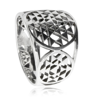 Širší stříbrný prsten pro ženy a muže je ozdoben motivy mandaly - magického geometrického obrazce. Prsten je vyroben ze stříbra o ryzosti 925/1000, které je mírně patinované.