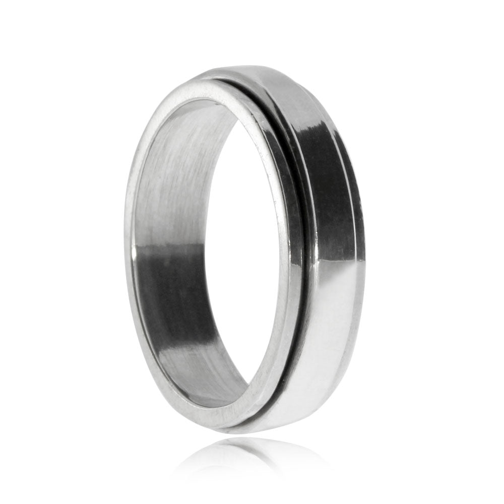 Lesklý stříbrný prsten vhodný pro muže i ženy je dvojitý s pohyblivým vnějším kroužkem. Tento unisex prsten byl vyroben ze stříbra o ryzosti 925/1000 a je leštěný, nikoliv rhodiovaný.