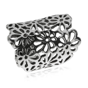 Dámský stříbrný prsten bez kamene je složen z drobných kytiček. Prsten je široký téměř 3 cm a je vyroben ze stříbra o ryzosti 925/1000. Povrchová úprava je starostříbrná.