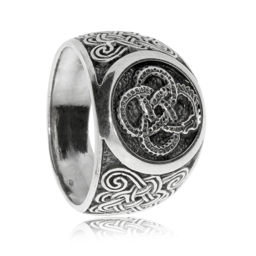 Široký stříbrný prsten vhodný zejména pro muže je ozdoben po stranách keltskými smyčkami a jeho korunu tvoří kruh s drakem požírajícím svůj vlastní ocas.