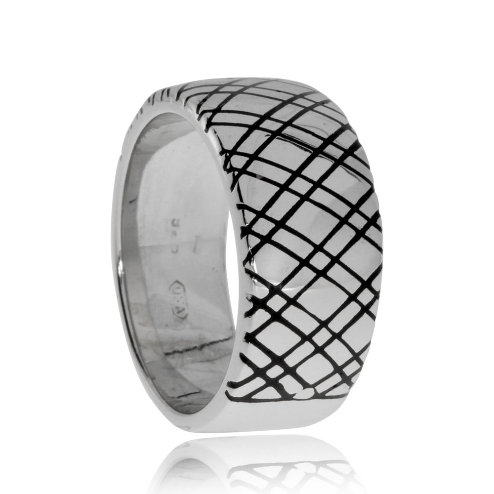 Široký a originálně zpracovaný prsten je vhodný pro ženy i muže s oblibou v jednoduchém a nápaditém designu, který nikdy nevyjde z módy. Přední část kroužku je zdobená pravidelným vzorem složeným z rovných černých linií. Prsten je vyrobený ze stříbra s rhodiovaným povrchem.
