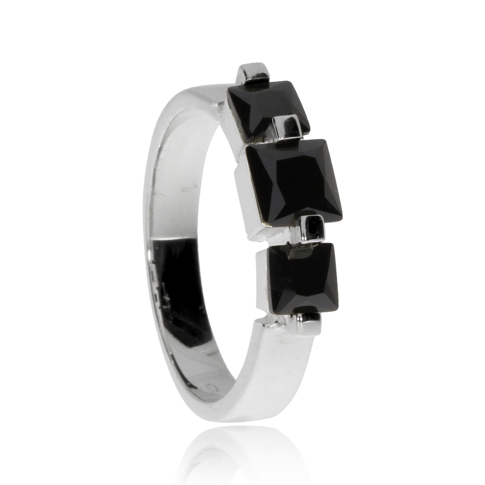 Velice zajímavý dámský prsten jistě potěší ženy a dívky, které mají v oblibě neobyčejné a osobité šperky. Prsten je vyrobený z kvalitního stříbra, ve kterém skvěle vynikají tři čtvercově broušené syntetické zirkony (cubic zirconia) černé barvy.