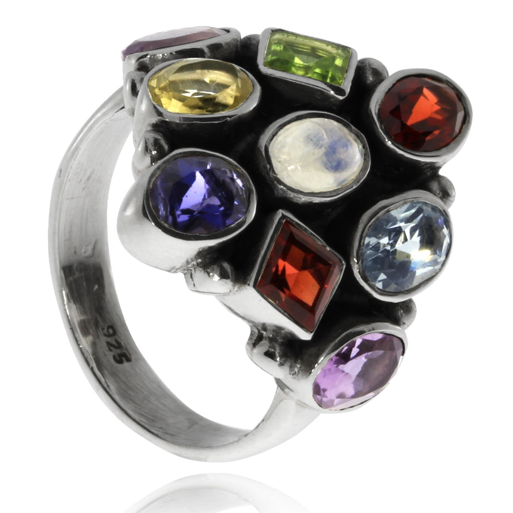 Skvostný dámský prsten, který vynikne mezi ostatními a hodí se pro ženy a dívky, které rády vystoupí z davu. Prsten je vyrobený ve starostříbrné povrchové úpravě a zdobí ho osázení různě barevnými a tvarovanými přírodními polodrahokamy. Skví se v něm granát, olivín, topaz, citrín, ametyst a měsíční kámen.