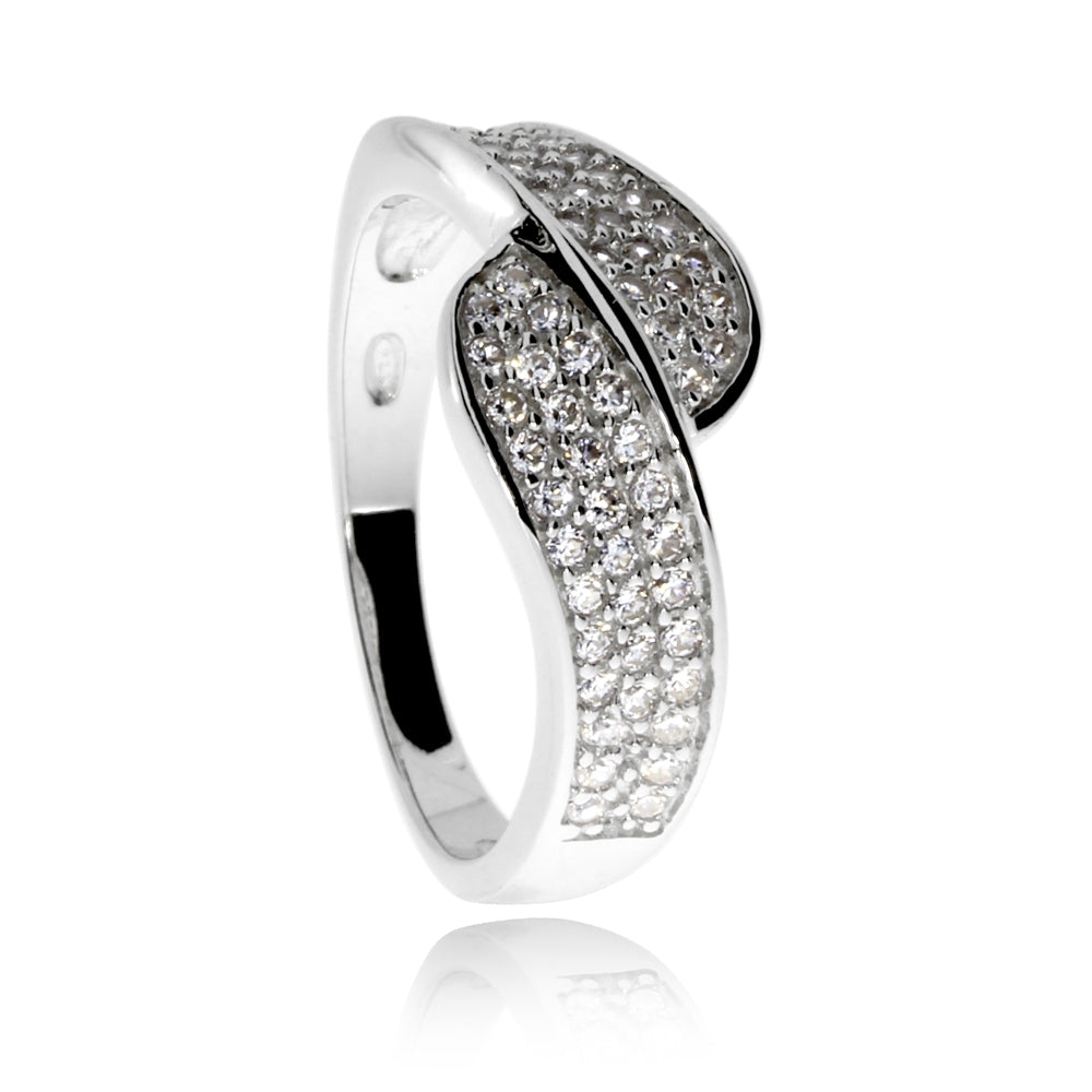 Překrásný rhodiovaný stříbrný prstýnek v sobě spojuje eleganci tradičních šperků a moderní minimalistický design. Kolem střední křivky se zrcadlově po obou stranách rozvíjí jemné linie, jejichž plocha je hustě posetá nádherně třpytivými syntetickými zirkony (cubic zirconia). Na ruce působí prstýnek decentně a hodí se i pro každodenní nošení.
