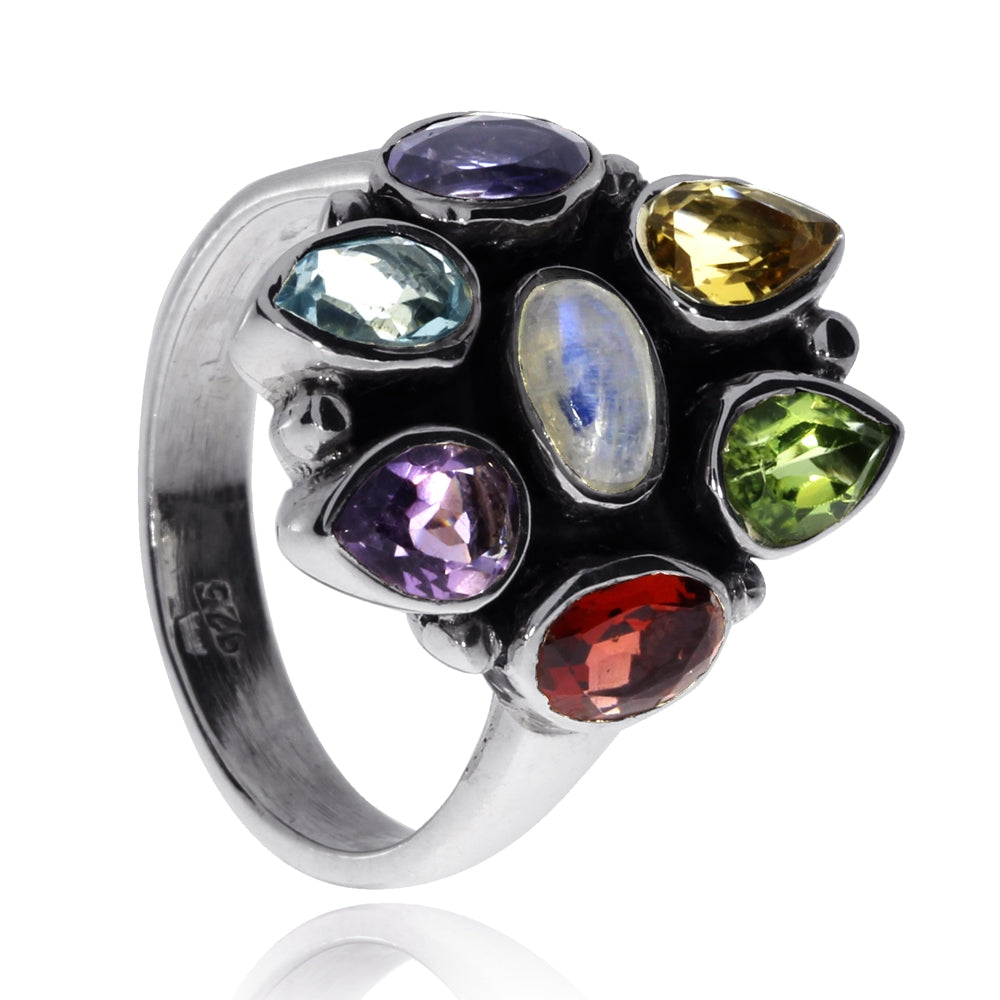 Úchvatný dámský prsten, který se pyšní třpytem přírodních polodrahokamů v různých barvách. Šperk je vyrobený ve starostříbrné povrchové úpravě a zdobí ho čirý měsíční kámen, červený granát almandin, fialový ametyst a safír, modrý topaz, zelený olivín a žlutý citrín.