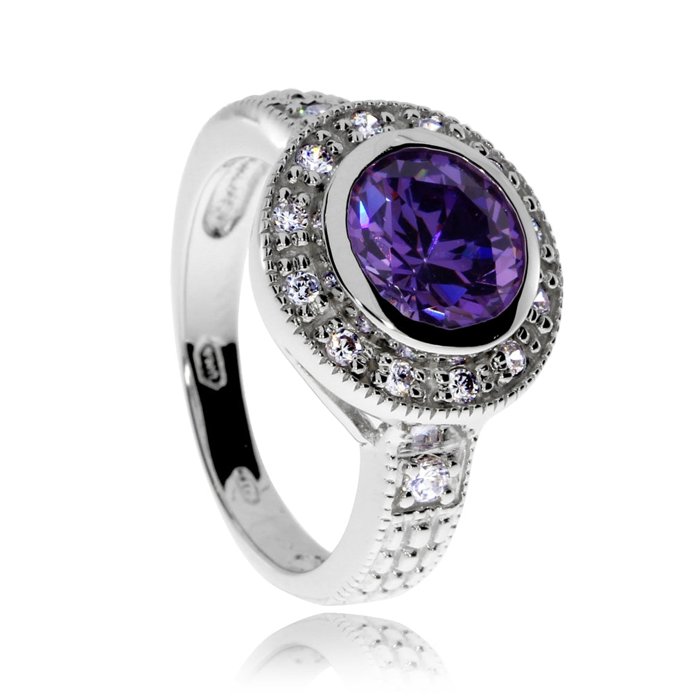 Stříbrný prsten se zirkony (cubic zirconia) a s povrchem rhodiovaného stříbra - fialový středový kámen