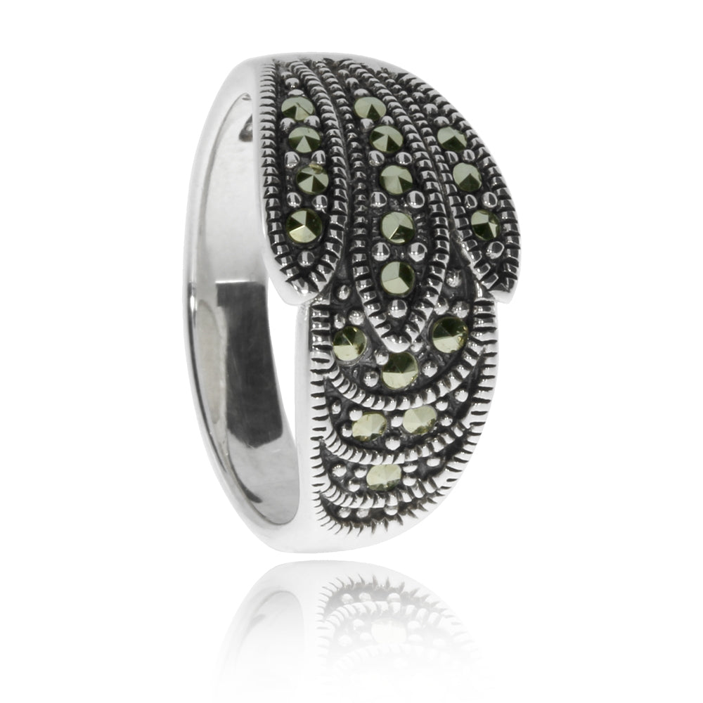 Originálně a velice krásně zpracovaný dámský prsten, který vyniká svým velice zajímavým a netradičním designem. Je vyrobený ze stříbra se starostříbrnou úpravou, ve které nádherně vynikají drobné třpytivé markazity, polodrahokamy s kovovým leskem.