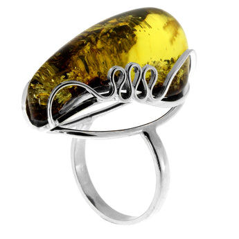 Velice originální a nápadný stříbrný dámský prsten, který zaujme každou dámu se zálibou v netradičních špercích. Velký prsten nese nádherný jantar jemně nazelenalé barvy. Jantar je vzácný, několik milionů let starý organický materiál, který vyniká nejen svým zbarvením, ale i zajímavou strukturou. Kámen je potom doplněný nápaditým stříbrným lůžkem, do kterého je vsazený.