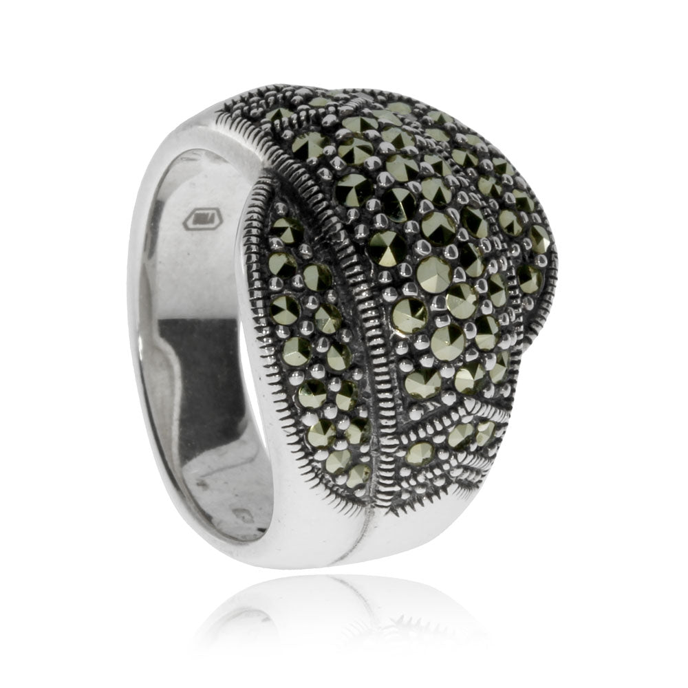 Skvostný dámský prsten, který představuje nápadně zdobené šperky v tom nejlepším světle. Prsten je vyrobený ve strarostříbrné povrchové úpravě, která pěkně zvýrazňuje jednotlivé detaily motivu. Ve tmavé starostříbrné ploše potom dobře vyniká kovový lesk drobných markazitů, polodrahokamů, kterými je prsten posetý.