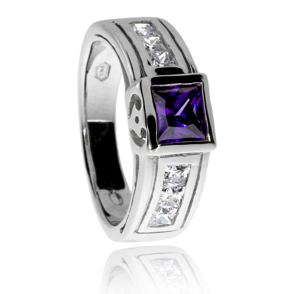 Stříbrný prsten se zirkony (cubic zirconia) a v povrchové úpravě rhodiované stříbro - fialový čtverec