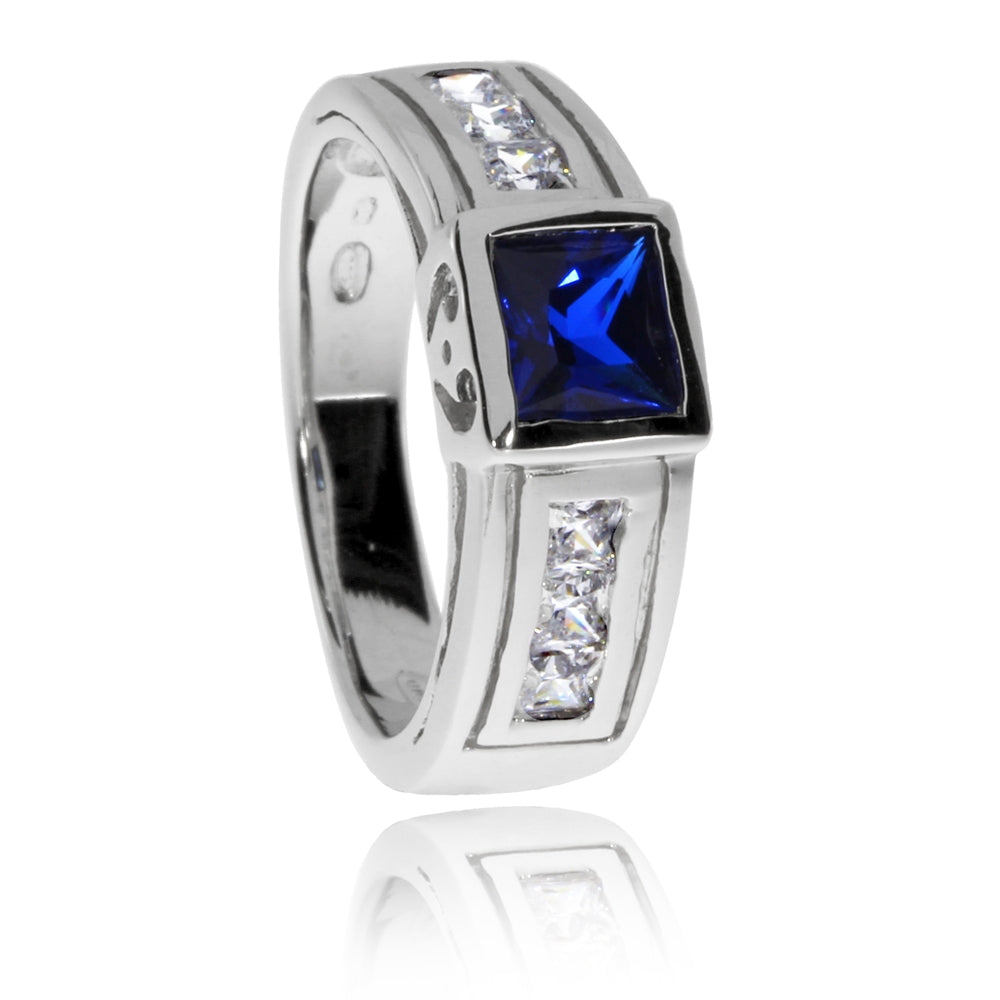 Originální a jednoduše zpracovaný dámský prsten, který působí elegantně a hodí se i pro každodenní nošení. Prsten je vyrobený ze zářivého a krásně lesklého rhodiovaného stříbra a přední část kroužku zdobí osázení čirými syntetickými zirkony (cubic zirconia). Ve středu prsten je potom zasazený modrý syntetický kámen čtvercového tvaru.