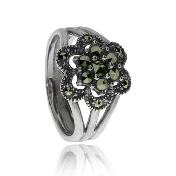 Půvabně jemný a nádherně zpracovaný dámský prsten je vyrobený z kvalitního stříbra a ve středu nese ozdobu doplněnou třpytem různě velkých markazitů, které se skví ve starostříbrné povrchové úpravě s drobným zdobením.
