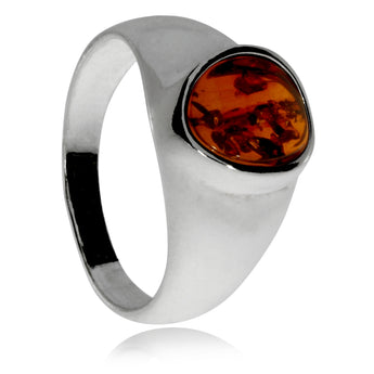 Nápaditý dámský prsten s neobvyklým zpracováním, které v sobě spojuje nekomplikovanou jednoduchost a nadčasovou eleganci. Prsten je vyrobený ze zářivého leštěného stříbra a na středu ho zdobí oválný kousek přírodního jantaru.