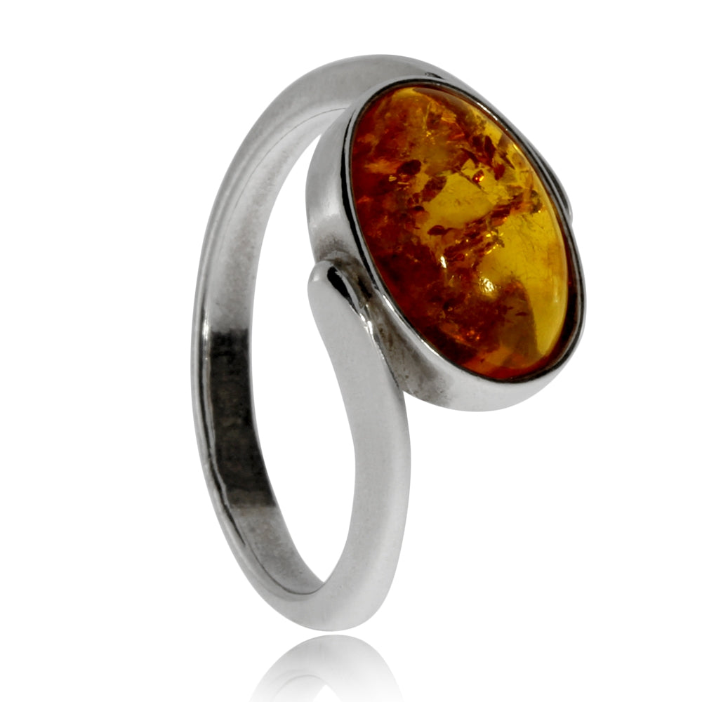 Elegantní dámský prsten, který skvěle doplní různé módní styly i příležitosti. Ve středu nese zasazený oválně opracovaný přírodní jantar, kolem kterého se vine ladná linie zářivého stříbra.