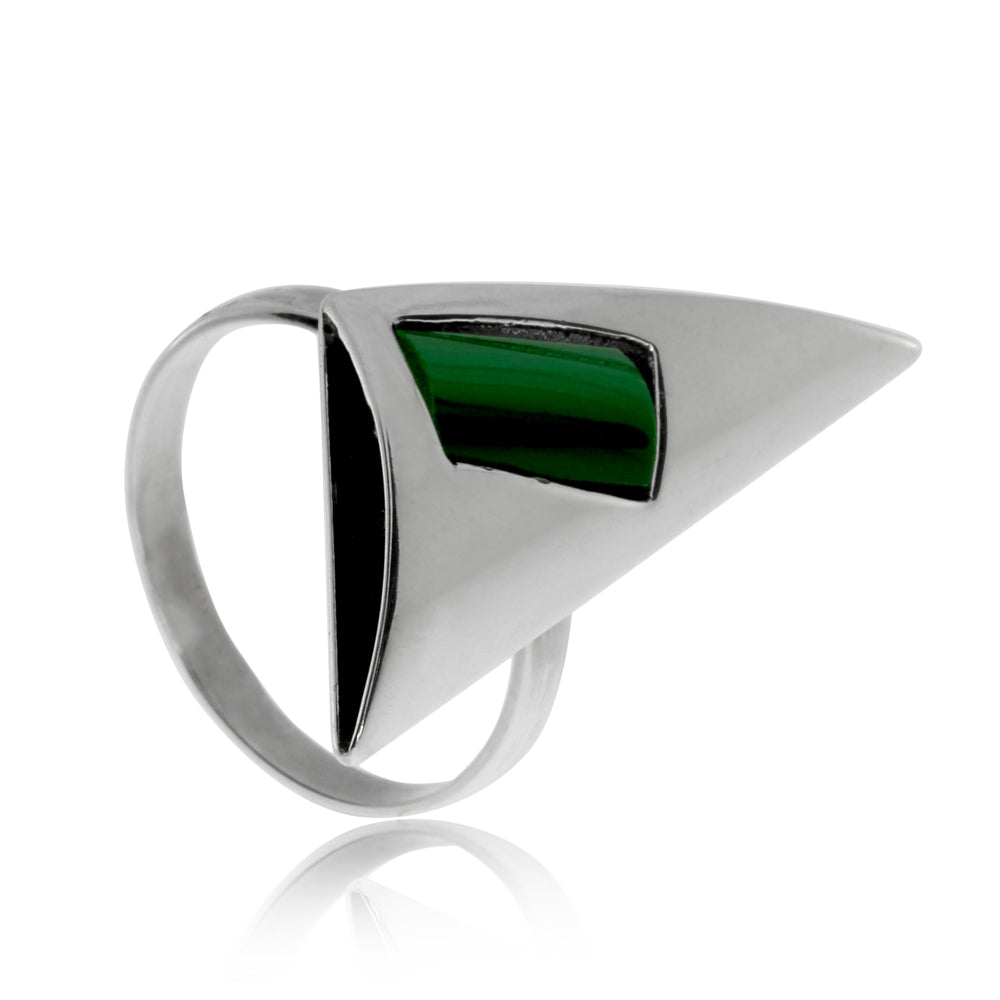 Moderní prsten zaujme především svým nezvyklým tvarem. Stříbrné lůžko ve tvaru trojúhelníku v sobě skrývá zasazený obdélníkový malachit. Tento šperk je vhodným doplňkem pro každou moderní ženu, zasazený kámen z prstenu udělá rovněž výbornou volbou pro slavnostní příležitosti.