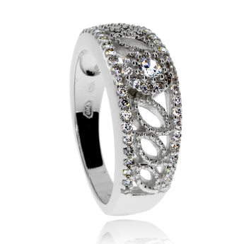 Stříbrný prsten se zirkony (kubická zirkonie), širší a bohatě zdobený