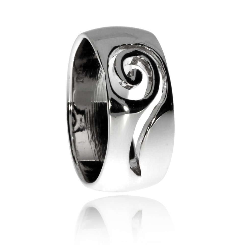 Poměrně široký a výrazný, avšak jednoduše elegantní dámský prsten s jemným výřezem ve tvaru spirály se skvěle hodí pro ženy a dívky, které dávají přednost nekomplikovanému stylu a nepotrpí si na přílišnou zdobnost. Prsten je vyrobený ze stříbra s rhodiovaným povrchem, který vyniká svou odolností a také leskem.