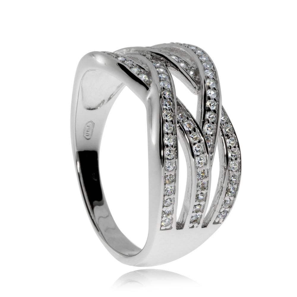 Stříbrný rhodiovaný prsten se zirkony (kubická zirkonie), čtyři zkřížené linie