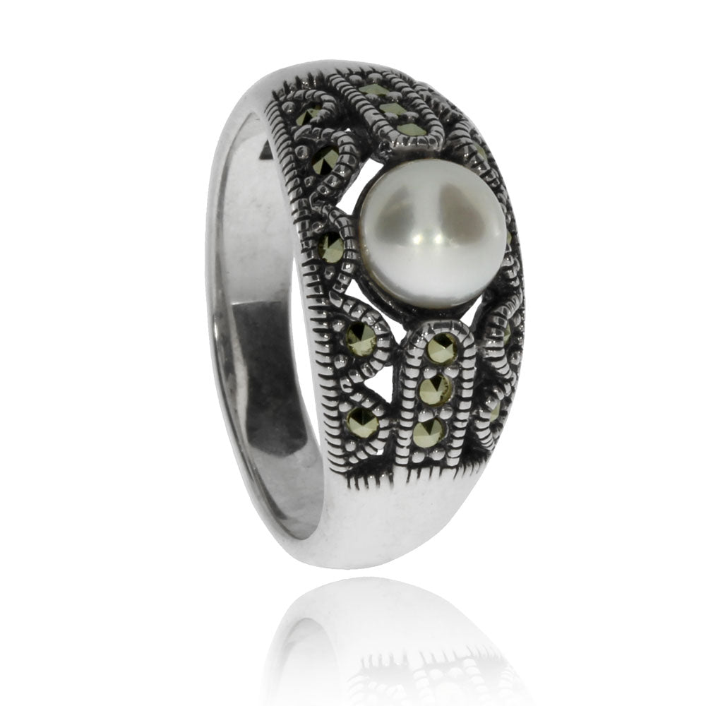 Krásně zpracovaný dámský prsten s netradičním půvabem a klasickými zdobnými prvky. Prsten je vyrobený ve starostříbrné úpravě a působí, jako by pocházel z dávných dob. Ve středu širšího kroužku s jemným předním zdobením spočívá bělostná říční perla, kterou doplňuje třpyt polodrahokamů markazitů.