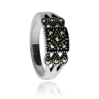 Okouzlující dámský prsten, který zaujme svým kontrastem s moderními a klasickými prvky. Prsten je vyrobený ve starostříbrné úpravě a jemné zdobení vyobrazuje jednoduchý geometrický motiv, který doplňuje třpyt kovově lesklých markazitů.