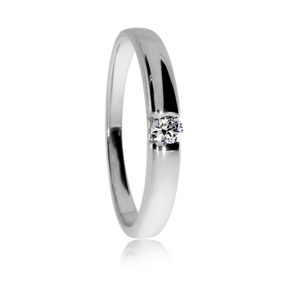 Stříbrný rhodiovaný prsten má diamant o průměru 2,8 mm zasazený do obroučky tak, že nevyčnívá. Diamant kulatého briliantového brusu SI1/G o hmotnosti 0,08 ct je zářivou ozdobou prstenu. Elegantní jednoduchost tohoto designu bude přitažlivá pro ženy, které si nepotrpí na výstřední a nápadné kreace.
