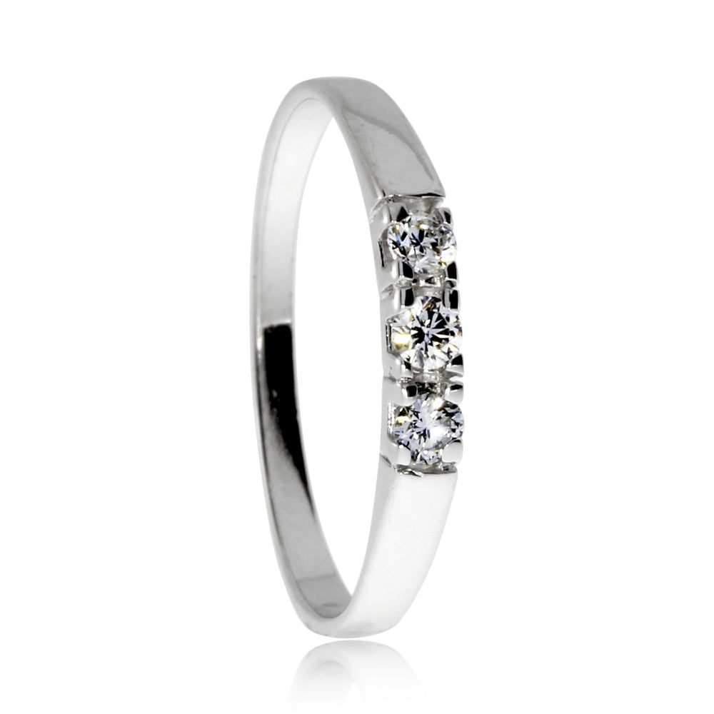 Stříbrný prsten velmi oblíbeného designu, kde jsou v řadě vedle sebe zasazené tři diamanty o průměru 2,38 mm, celkové hmotnosti 0,15 ct v parameter čistoty SI1 a v barvě G.